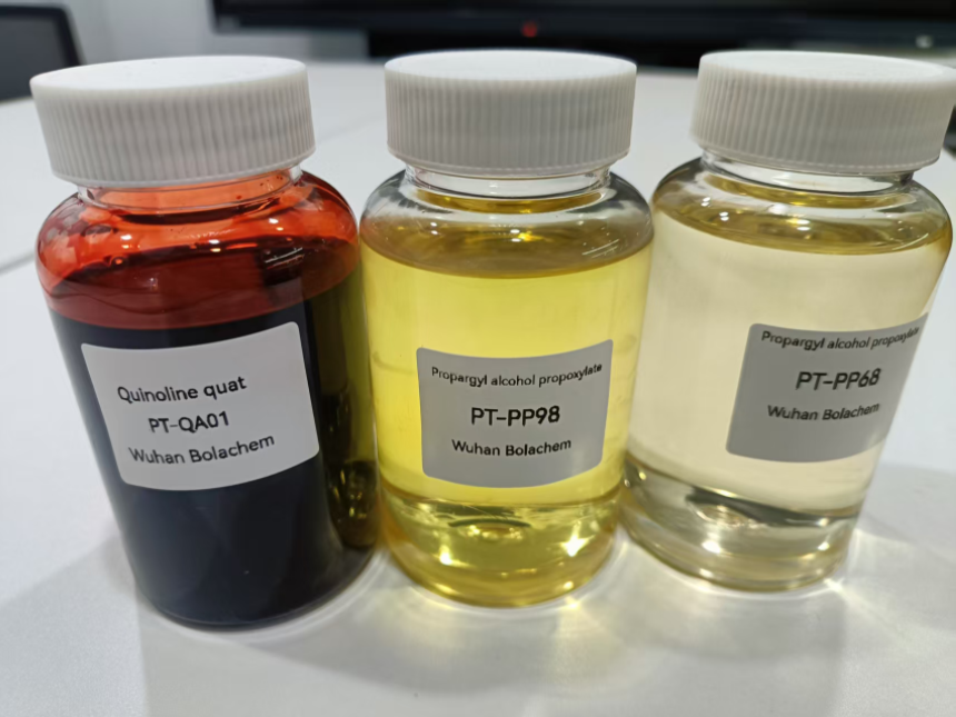 In addition, Bolachem's self-developed propargyl alcohol propoxylate intensifier, a new generation of acid corrosion inhibitor concentrate and enhancer, is a green and environmentally friendly alternative to propargyl alcohol. Compared with traditional corrosion inhibitors, it offers excellent cost-effectiveness, high performance-to-price ratio, and is non-corrosive and non-toxic, possessing superior toxicological and ecological advantages. It can be used alone as a corrosion inhibitor at low temperatures, and can be combined with various types of corrosion inhibitors to produce synergistic effects at high temperatures. Using the same testing method, a high-temperature corrosion inhibitor was formulated with benzyl chloride quinoline salt as the main component and propargyl alcohol propoxylate as the auxiliary component in a certain proportion. The test results basically met the 160℃ 5405 standard requirements.